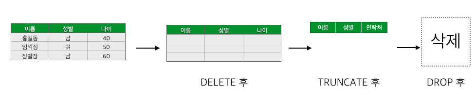 - TRUNCATE와 WHERE 절을 함께 사용할 수 없습니다.(개별적으로 행 삭제 불가능)