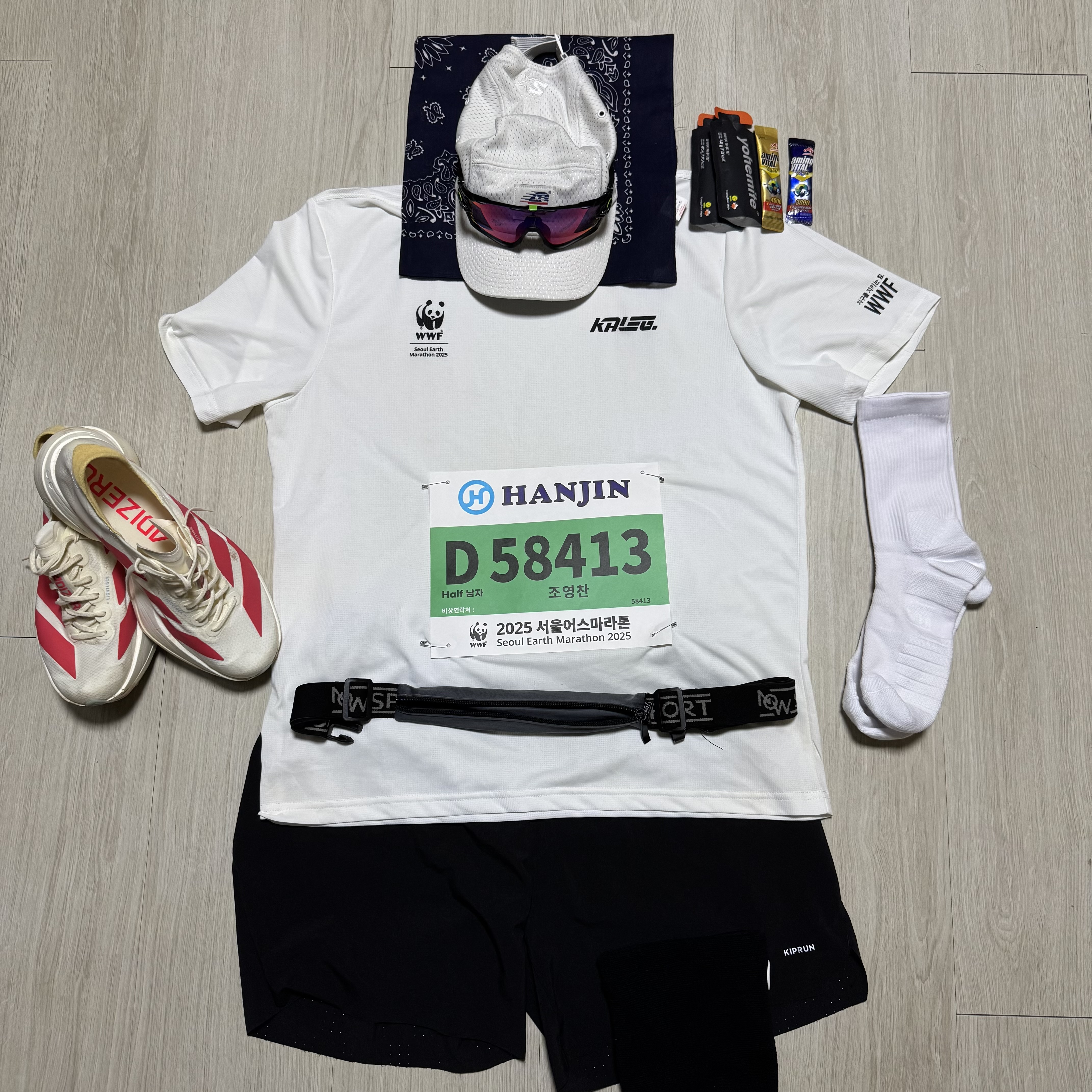 러닝화, 양말, 모자, 에너지젤, 러닝벨트, 그리고 나의 58413번 배번호..