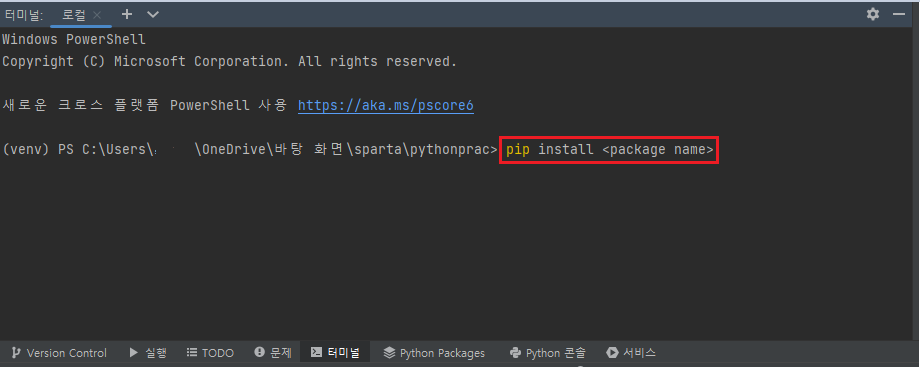 Python 에서 패키지는 모듈(일종의 기능들 묶음)을 모아 놓은 단위입니다. 이런 패키지 의 묶음을 라이브러리 라고 볼 수 있습니다. 지금 여기서는 외부 라이브러리를 사용하기 위해서 패키지를 설치합니다.