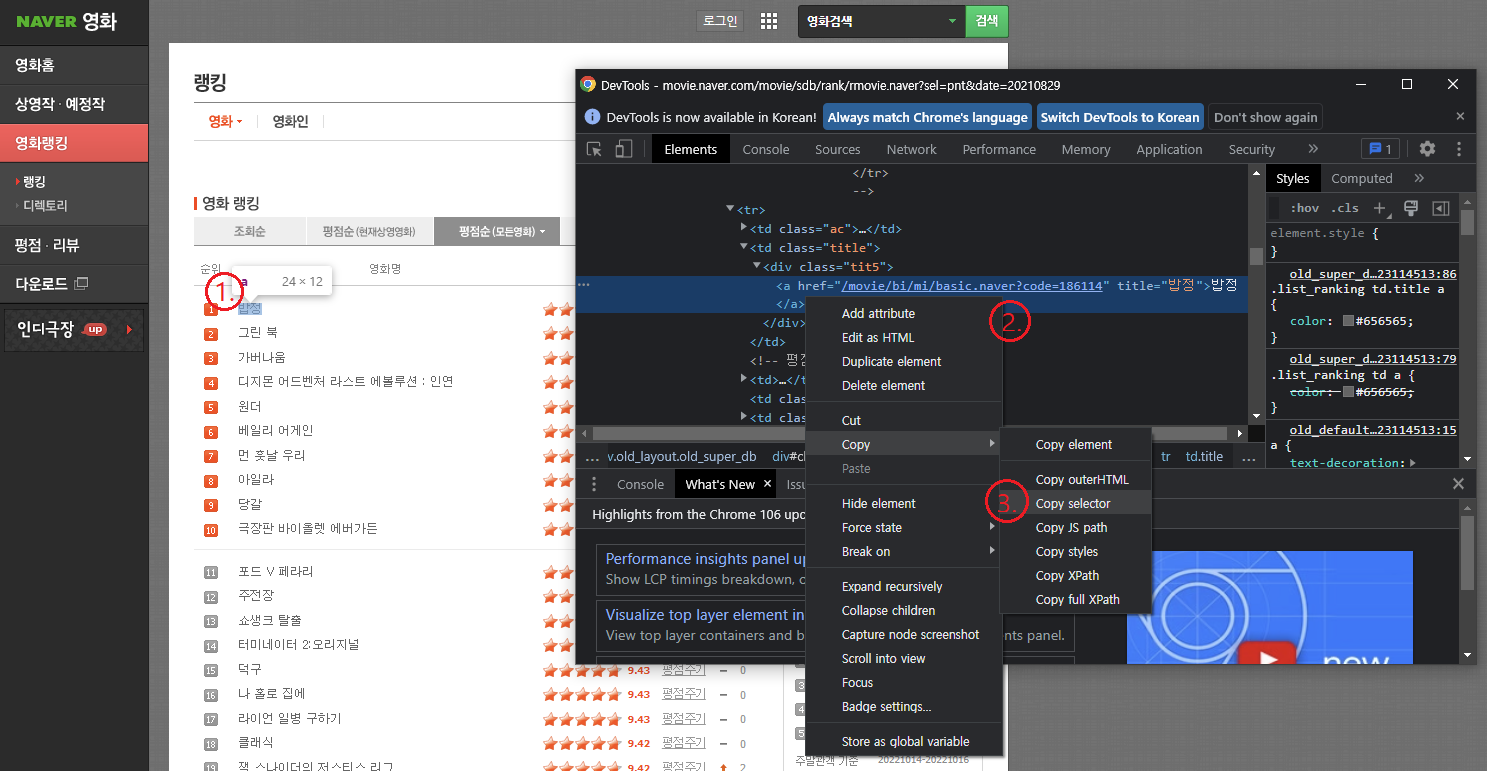 3. Copy → Copy selector로 선택자를 복사할 수 있음
