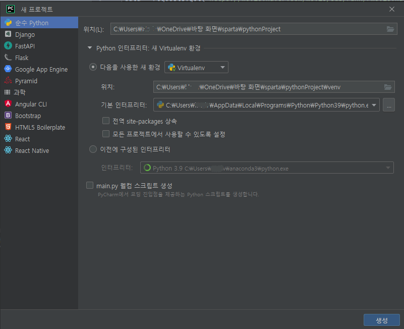 위 처럼 해주시면 가상 환경도 같이 생성됩니다!