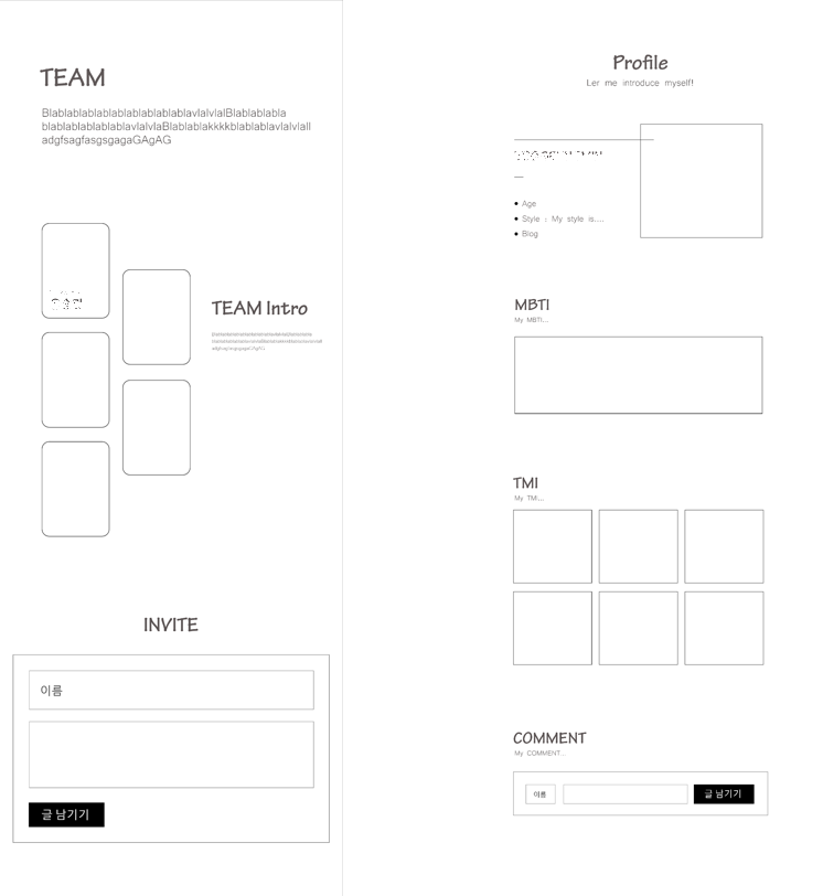 오른쪽은 상세페이지로 메인페이지의 팀원들 카드를 클릭시 팀원의 상세 정보를 볼 수 있게 페이지를 따로 제작하여 연결할 예정입니다. 팀원들의 상세 정보를 보고 댓글을 남길 수 있도록 구현해 볼 예정입니다.