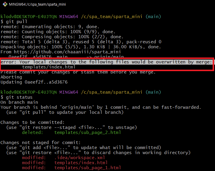git에서 pull 할 시 이러한 에러가 뜨는 경우가 있습니다. 혹시나 하는 마음으로 git status로 상태를 확인해 봤더니 일부만 적용되고 대부분은 적용되지 않았습니다.