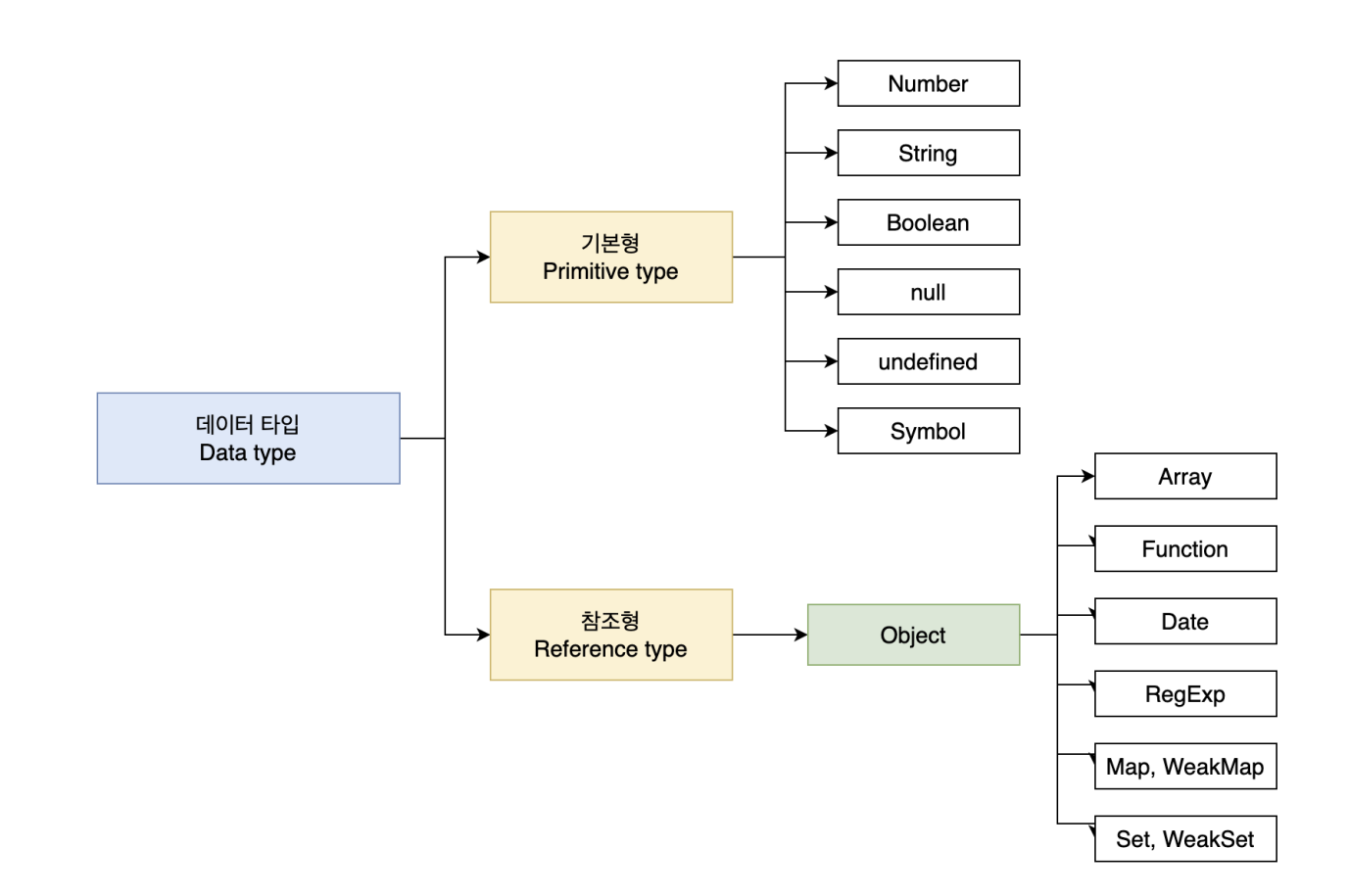 얕은 복사와 깊은 복사에 대해서 이해하기 위해서 우선 자바스크립트 데이터 타입인 원시 타입과 객체 타입에 대해 이해해야 합니다. 우선 원시 타입은 Number, BigInt, String, Boolean, Null, Undefined, Symbol 7개의 타입이 있고, 그 외 모든 데이터는 객체 타입입니다.