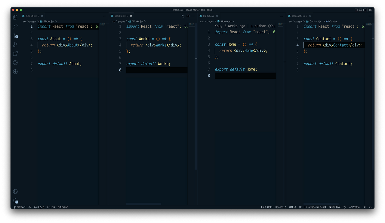 우선 여러개의 페이지를 배우는 것을 배우는 것이니, 가상의 여러페이지 Home, About, Contact, Works 만듭니다.