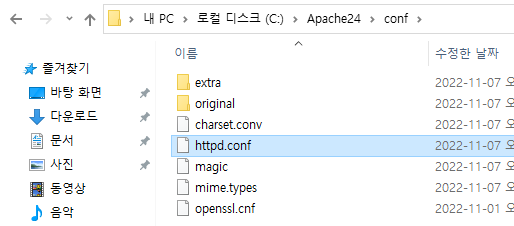 1) 우선 apache24 → conf → httpd.conf 파일을 메모장 혹은 vscode로 열어줍니다.