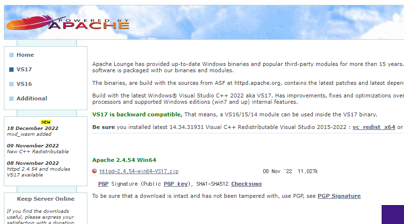 1. https://www.apachelounge.com/download/ 에 접속하여 다운로드합니다.